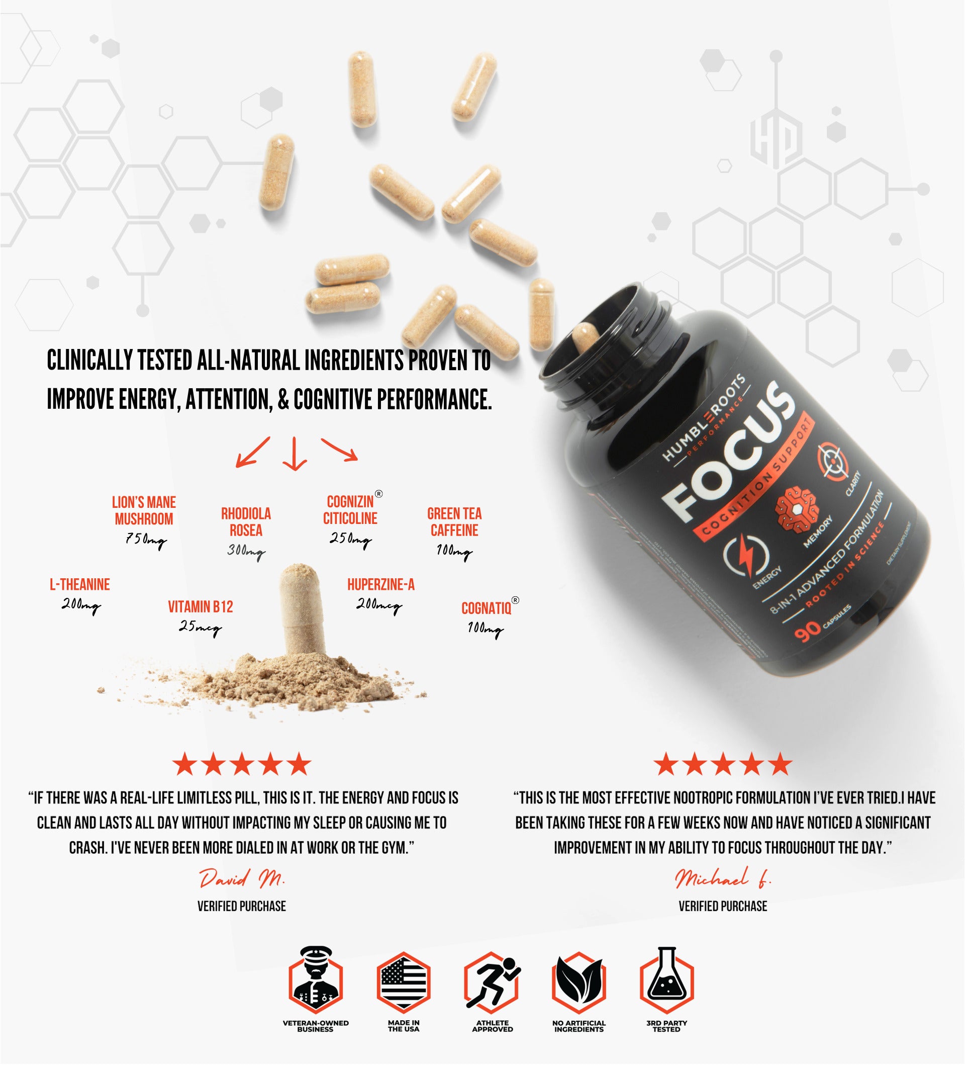 Our all-natural FOCUS capsules offer a synergistic blend of nootropics known for their ability to support brain health, sharpen concentration, and enhance memory retention.