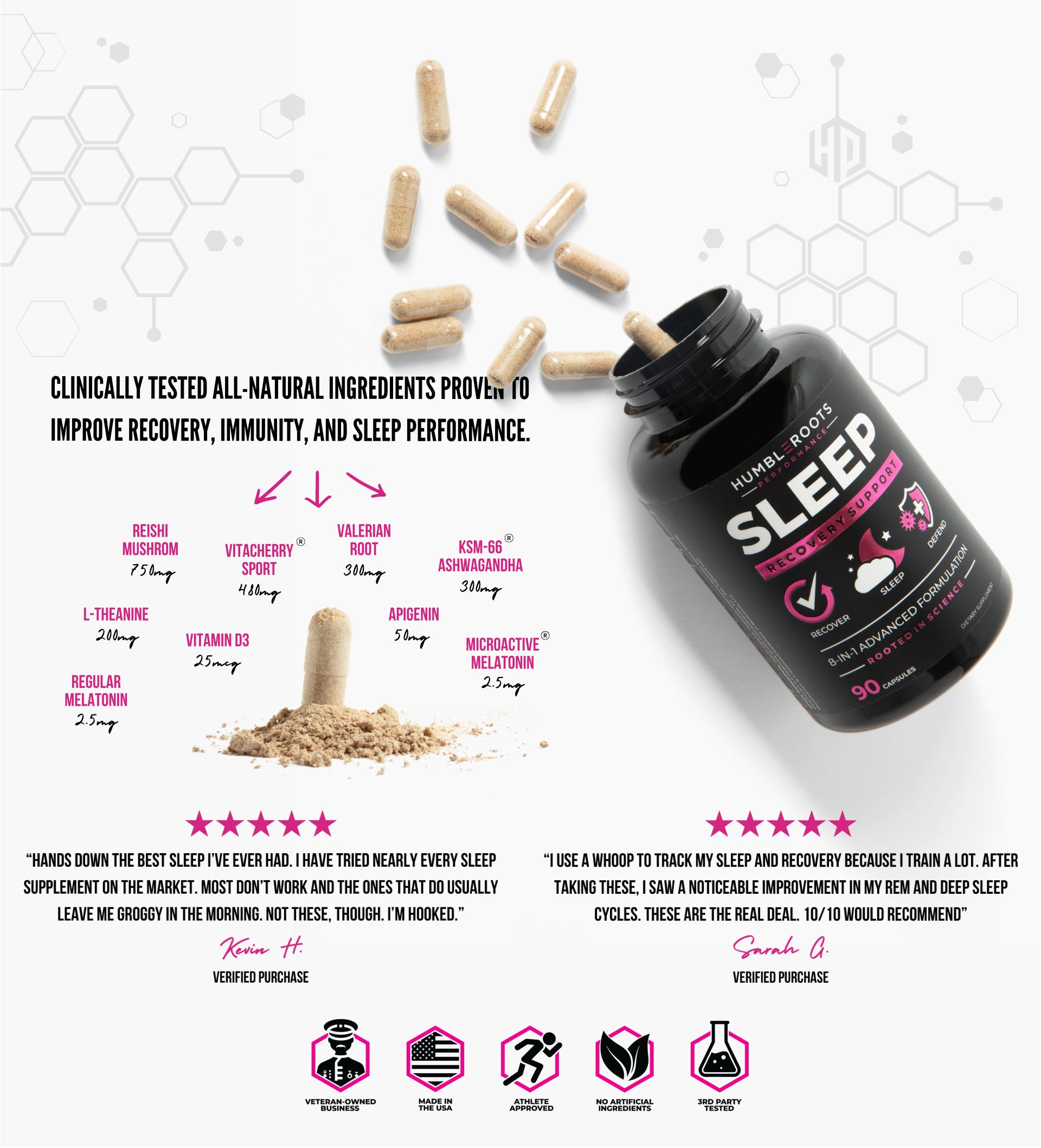 Our all-natural SLEEP capsules contain highly effective ingredients proven to improve overall sleep quality by optimizing your circadian rhythm, reducing stress, promoting recovery, and supporting immune function.